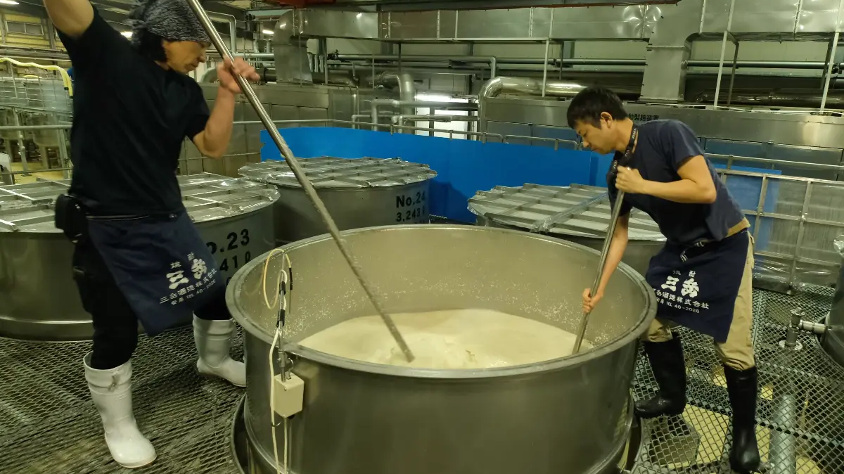 蔵人は高温の熱に弱い酵母のために温度管理をしながら、時をみて櫂をいれ発酵を促していきます。